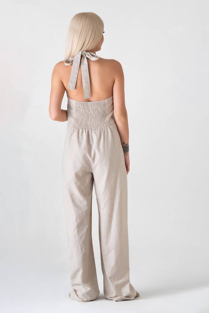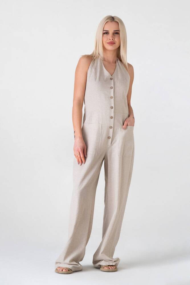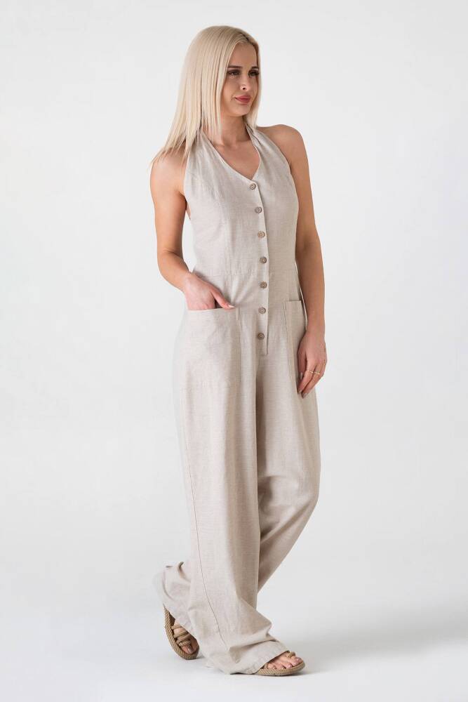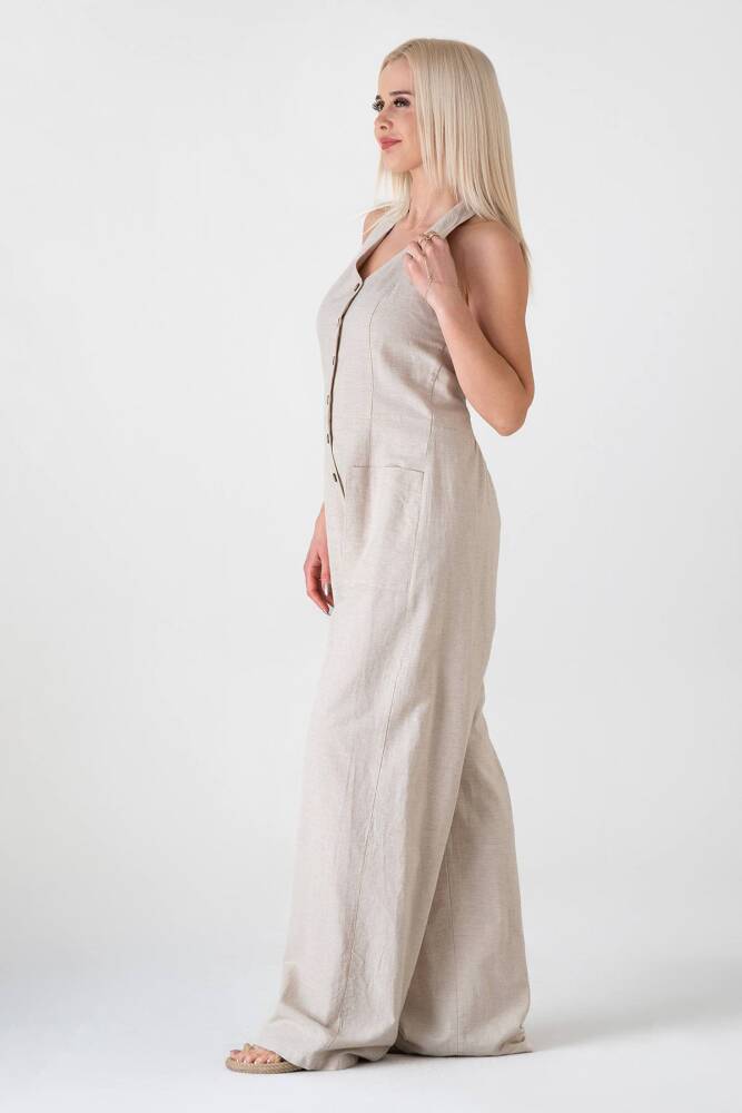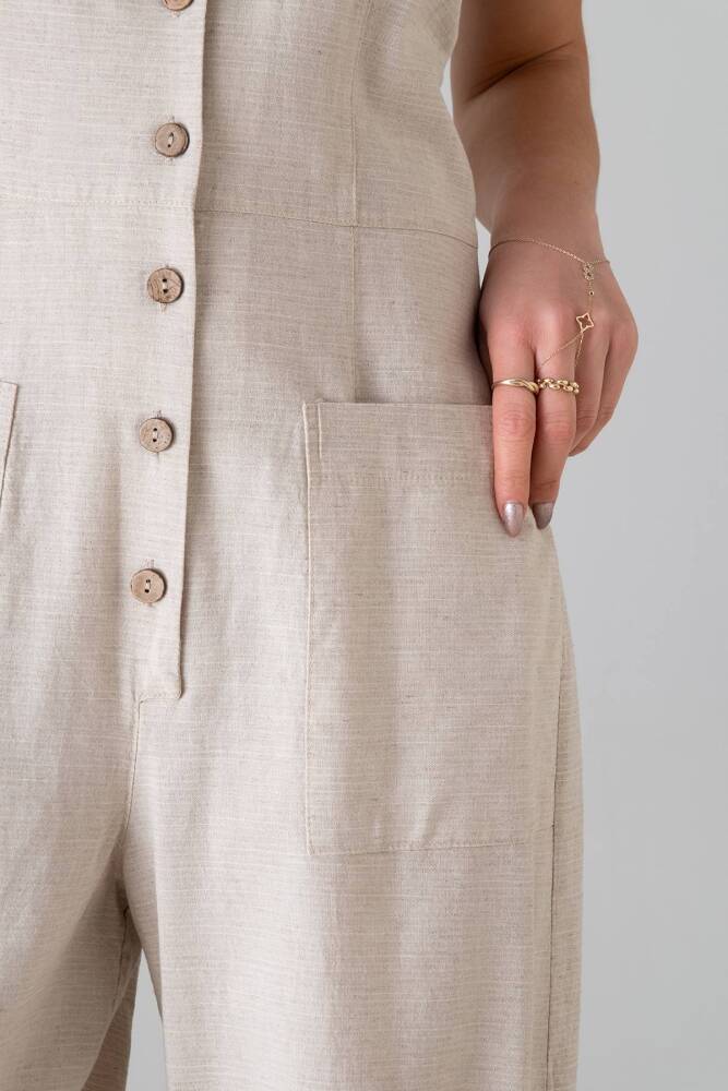 Gipa Detaylı Önü Düğmeli Cepli Keten Salopet Bej