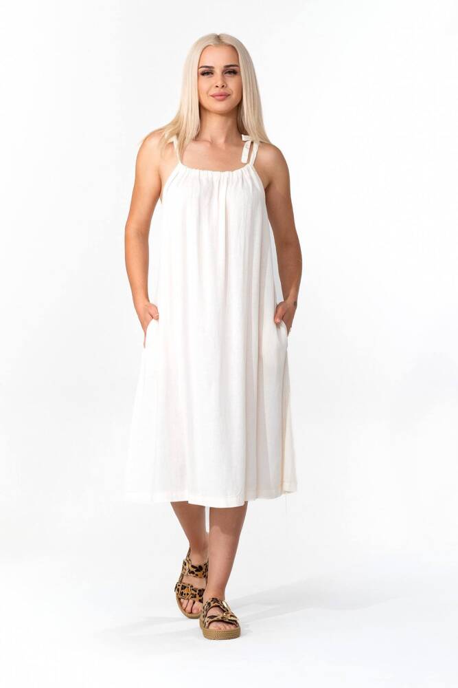 Keten Elbise %100 Doğal Kumaş Cep Detaylı Salaş Ekru