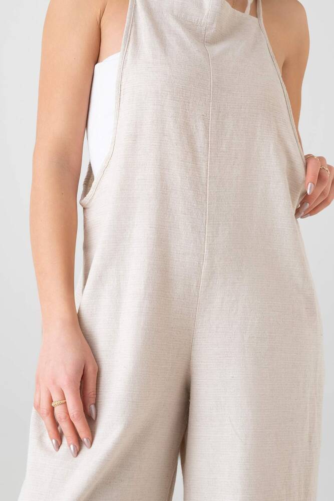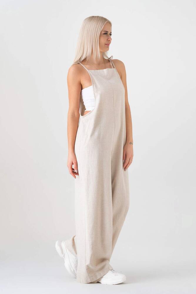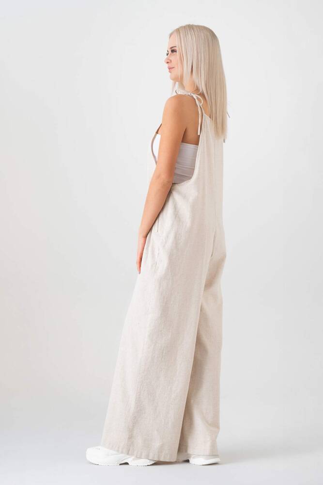 Rahat kesim olan keten içerikli salopet modelimiz askı kısmı bağlamalıdır ve boyunu istediğiniz şekilde ayarlayabilirsiniz. Ürün geri dönüşüme uygun şekilde üretilmiş ve natural yapıdadır. İç göstermez ve terletmez. İki adet cep detayı bulunur. Konfor garantilidir.