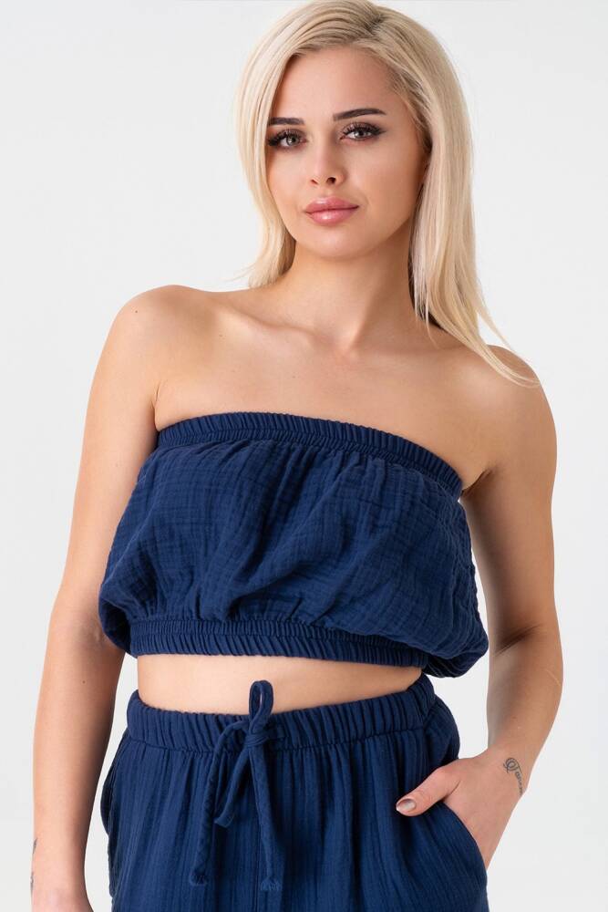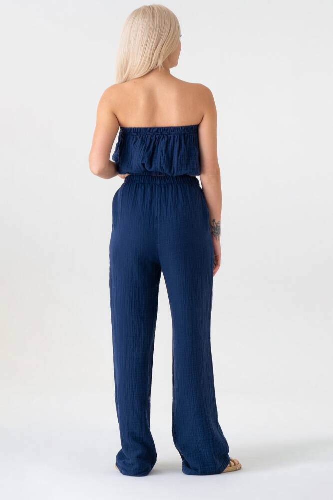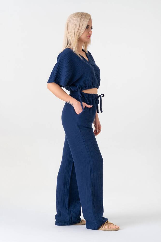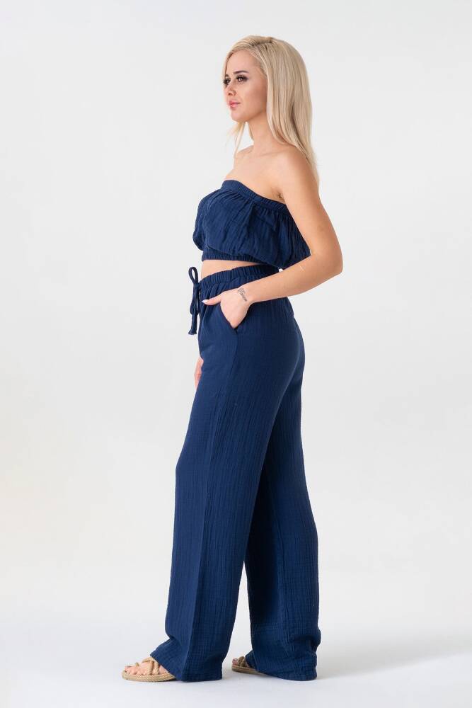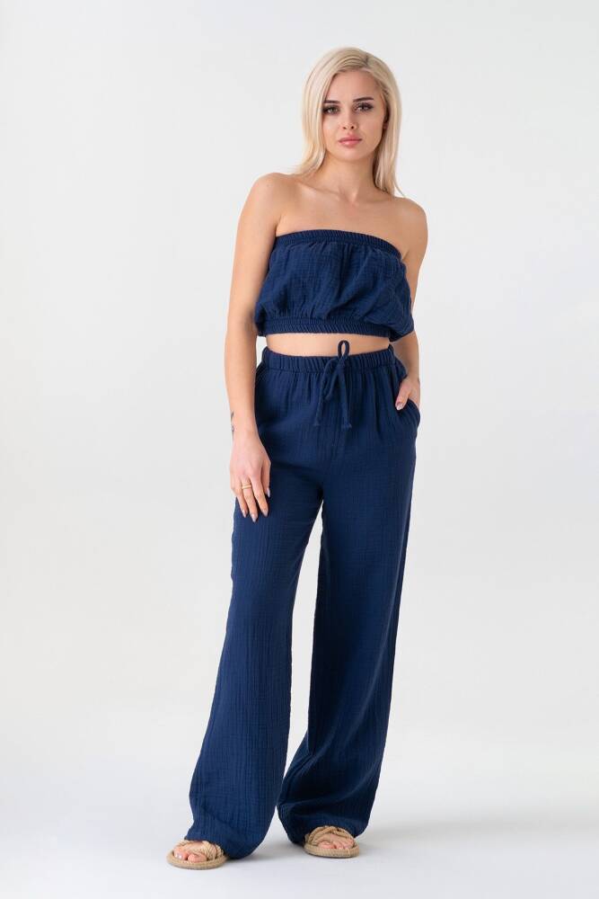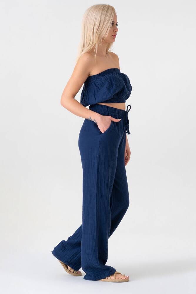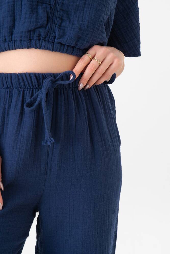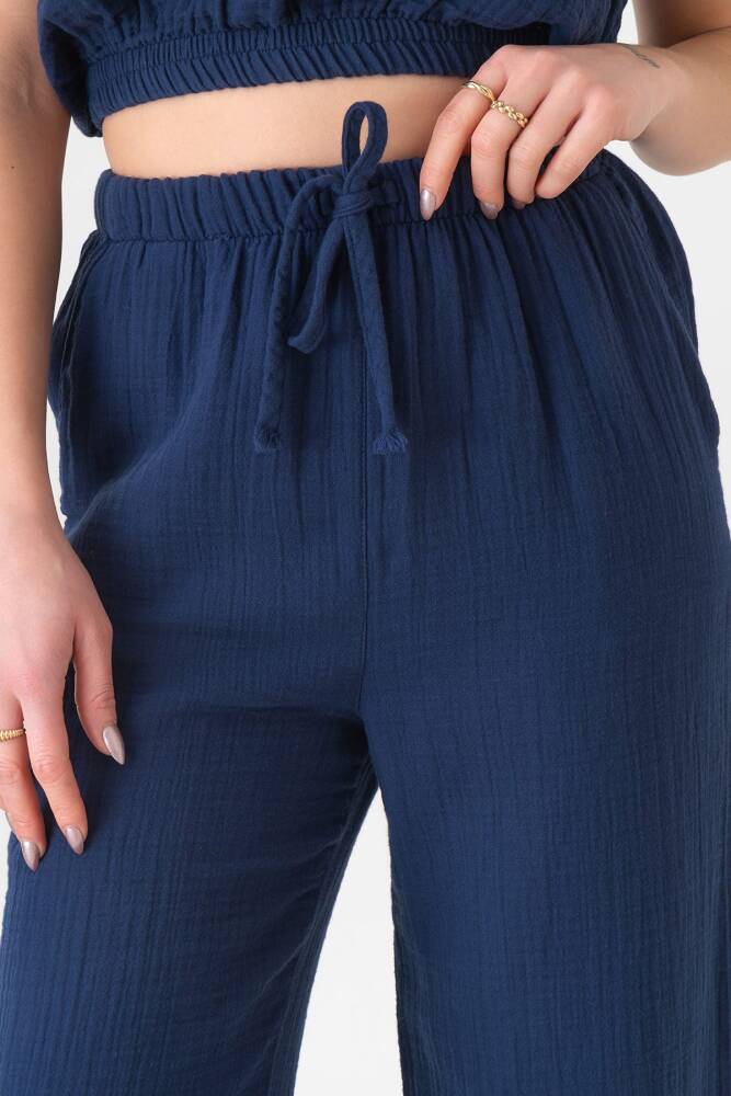 Müslin %100 Doğal Pamuk Beli Lastikli Bol Paça Pantolon Lacivert