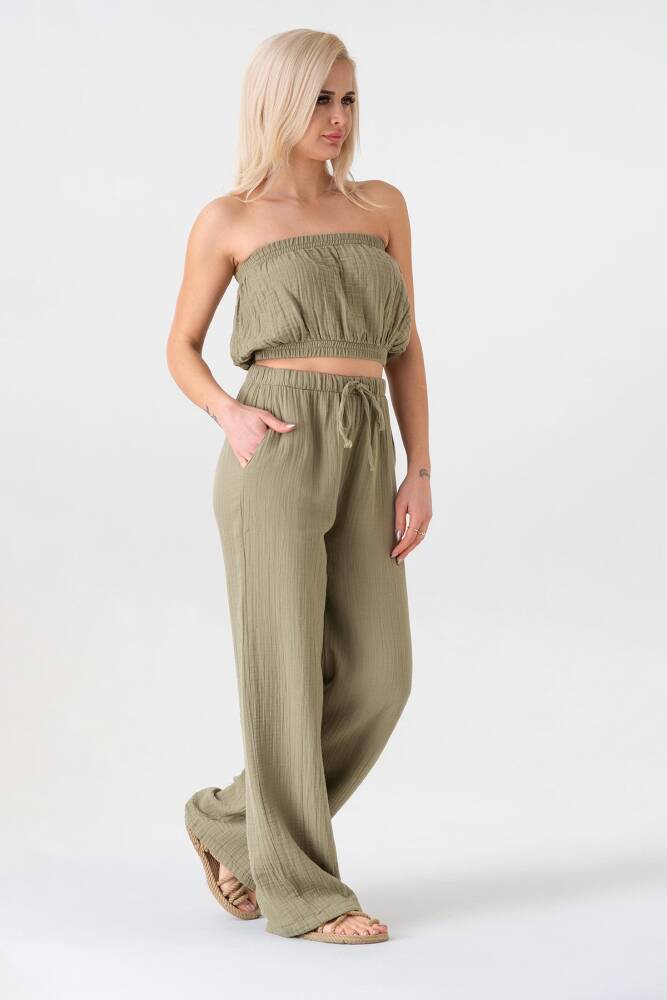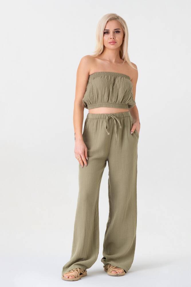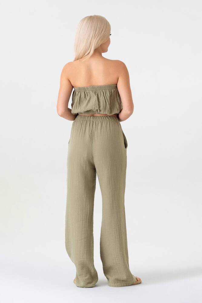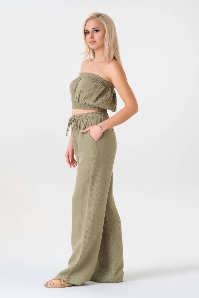 Müslin %100 Doğal Pamuk Beli Lastikli Bol Paça Pantolon Yeşil
