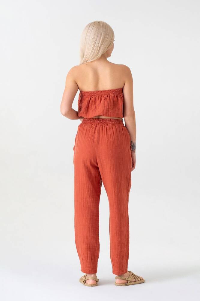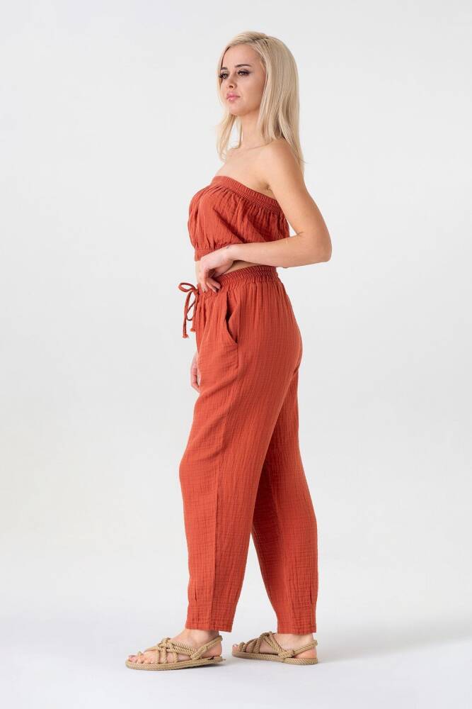 Müslin Beli Lastikli Bileği Pensli %100 Pamuk Kadın Pantolon Kiremit
