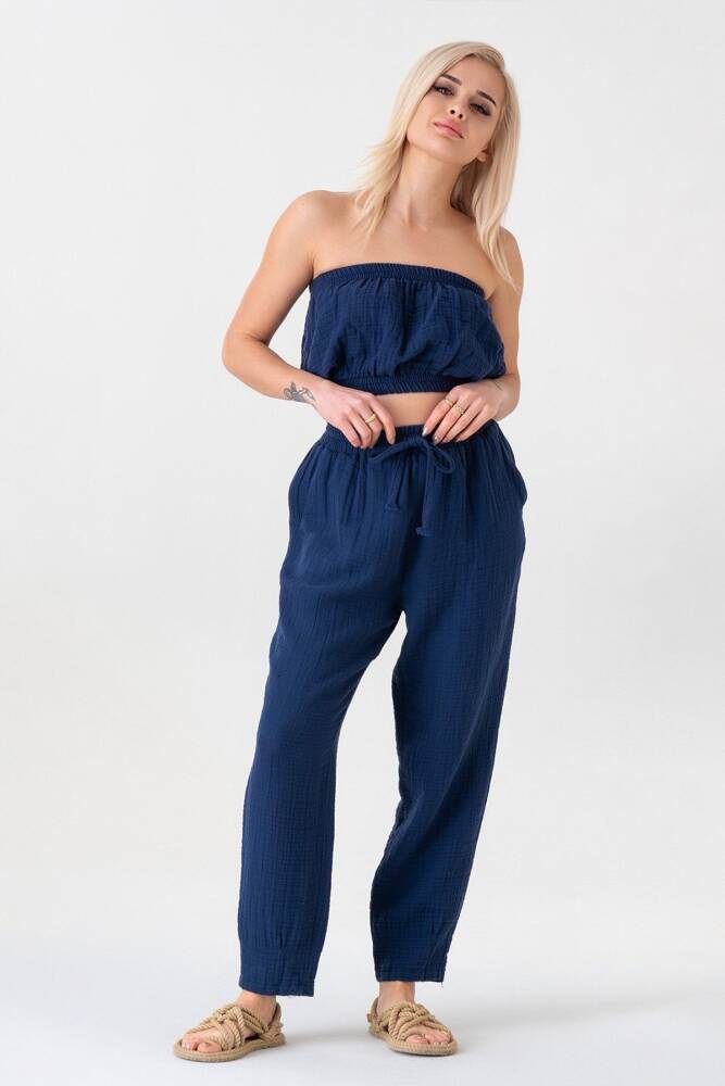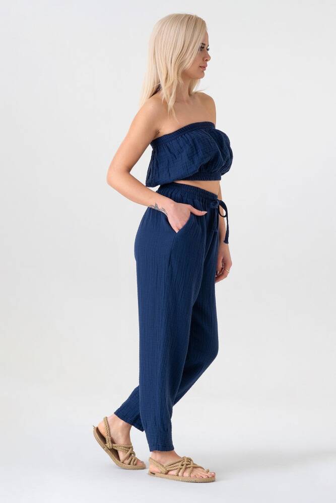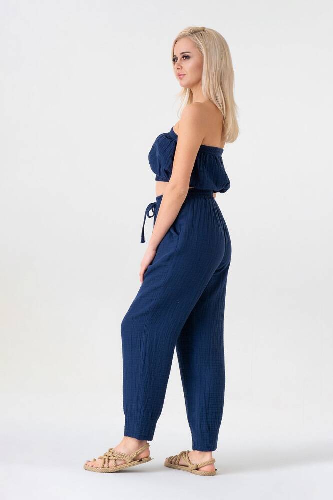 Müslin Beli Lastikli Bileği Pensli %100 Pamuk Kadın Pantolon Lacivert