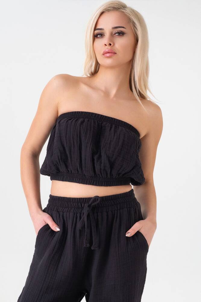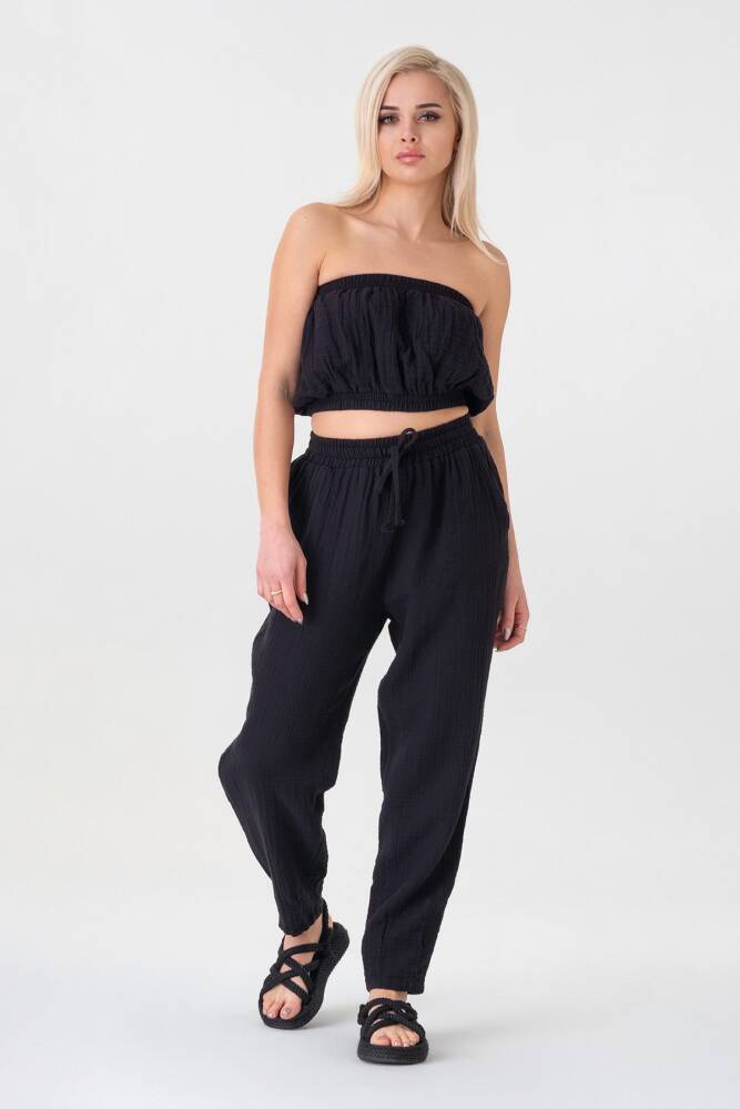 Müslin Beli Lastikli Bileği Pensli %100 Pamuk Kadın Pantolon Siyah