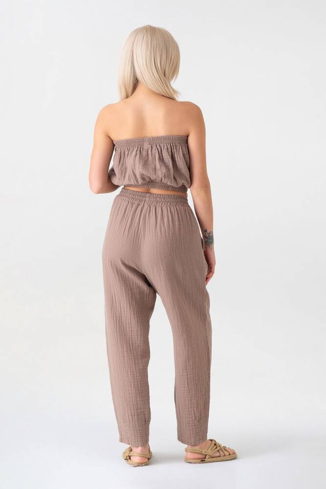 Müslin Doğal %100 Pamuk kumaştan üretilmiş kadın pantolon modelidir. İki adet cebi mevcuttur. Dar paçası pens detaylıdır. Beli lastikli olup organik yapısı ile geri dönüşüme uygun şekilde üretilmiştir.