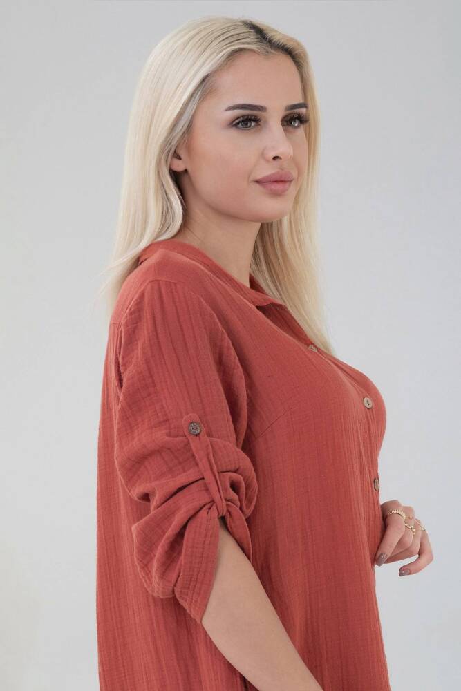 Müslin Doğal Kumaş Pamuk Önü Düğmeli Uzun Gömlek Elbise Kiremit