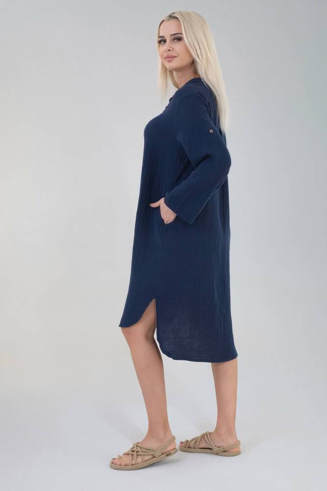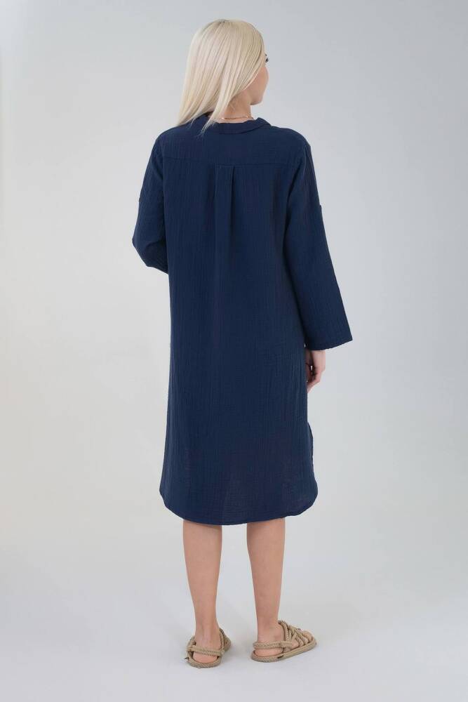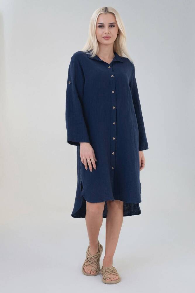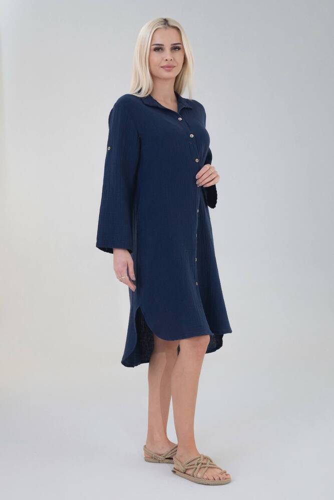 Müslin Doğal Kumaş Pamuk Önü Düğmeli Uzun Gömlek Elbise Lacivert