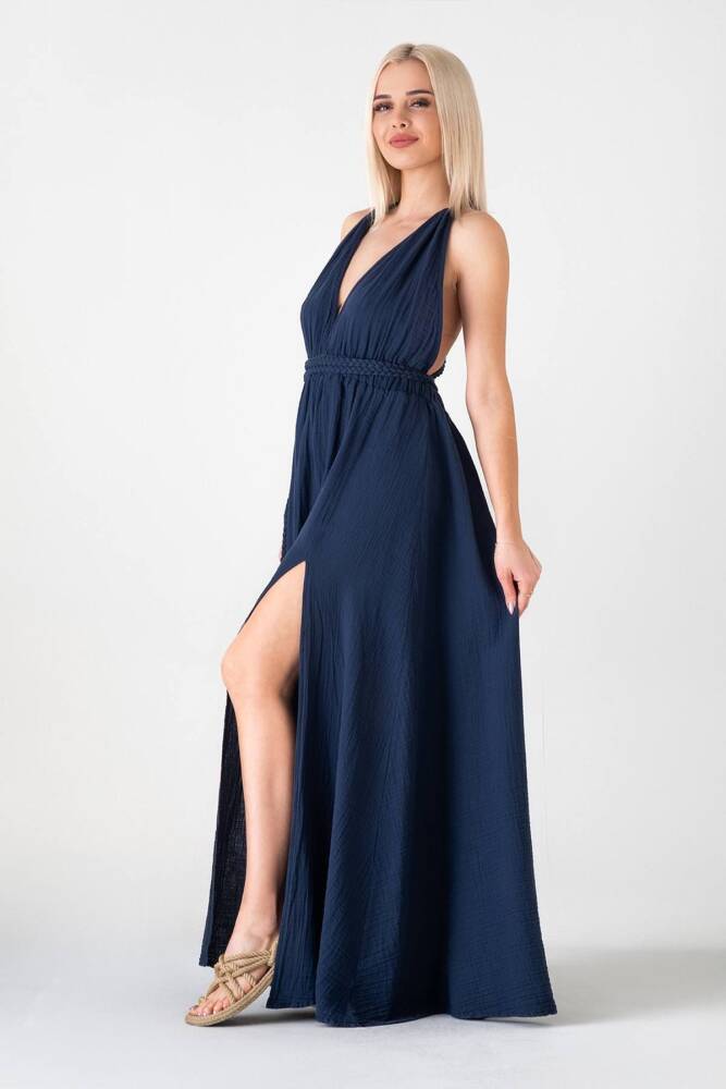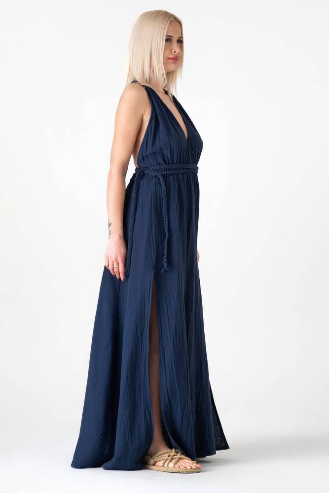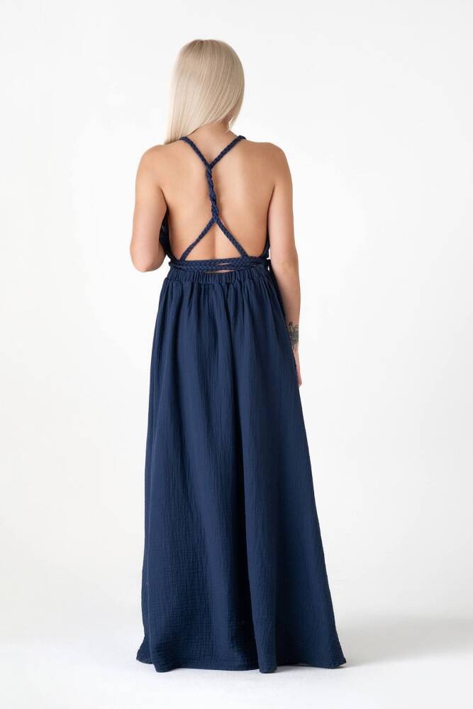 Müslin Elbise Doğal Pamuktan Üretilmiş Örgü Detaylı Plaj Elbisesi Lacivert