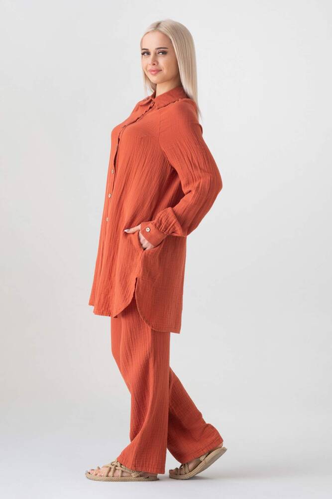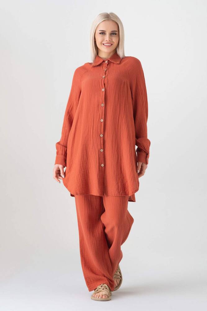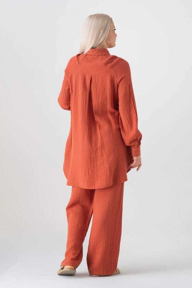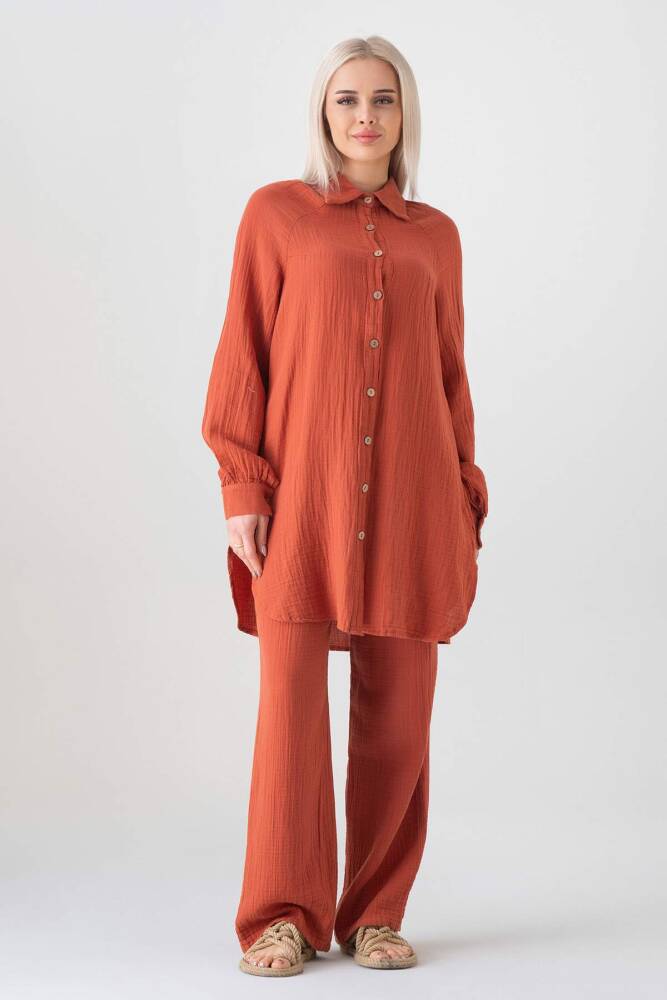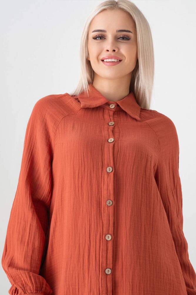 Müslin Kumaş %100 Pamuk Reglan Kol Bayan Gömlek Kiremit