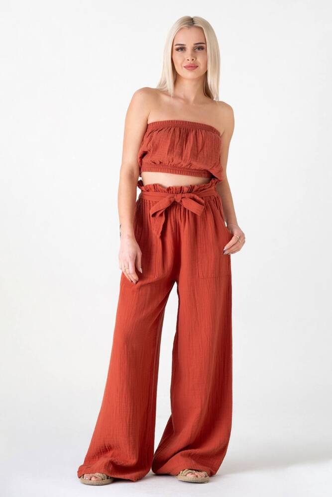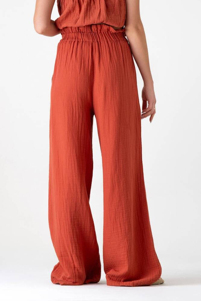 Müslin Kumaş %100 Pamuk Yüksek Bel Büzgü Detay Cepli Müslin Pantolon