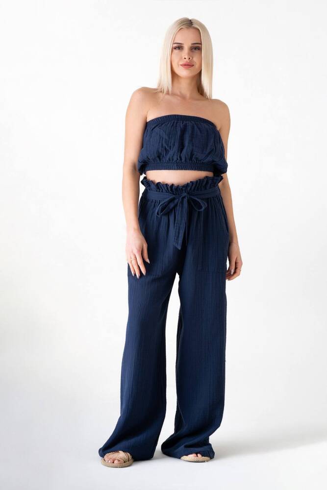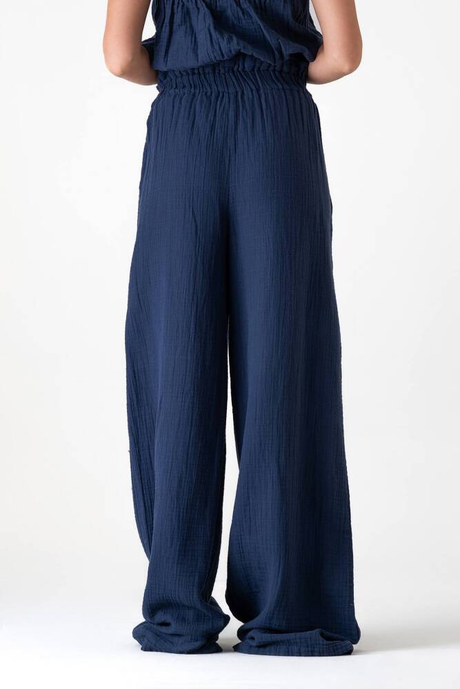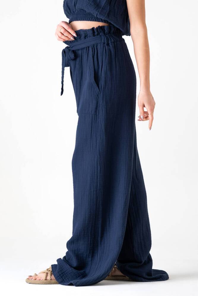 Müslin Kumaş %100 Pamuk Yüksek Bel Büzgü Detay Cepli Bayan Müslin Pantolon Lacivert
