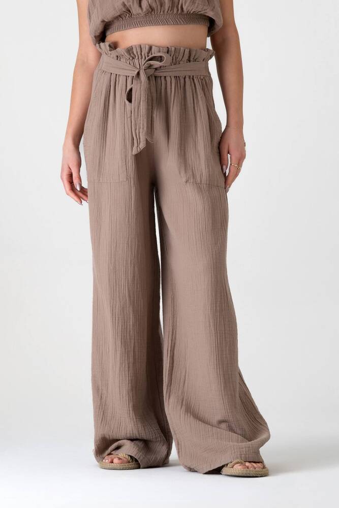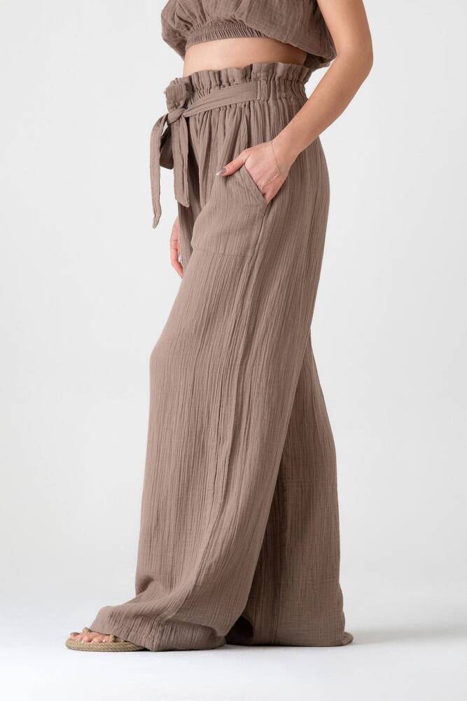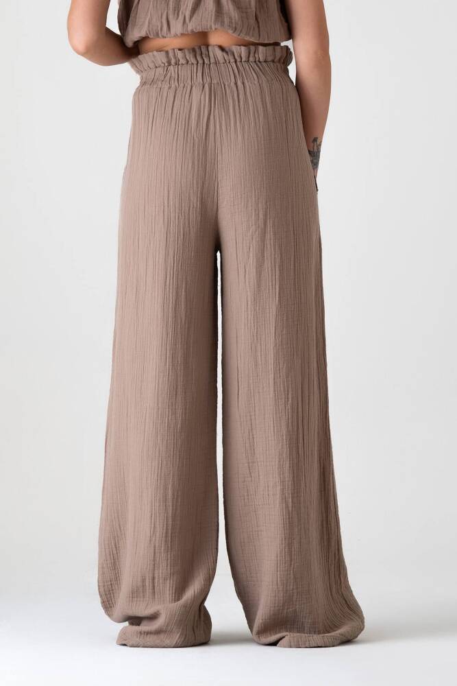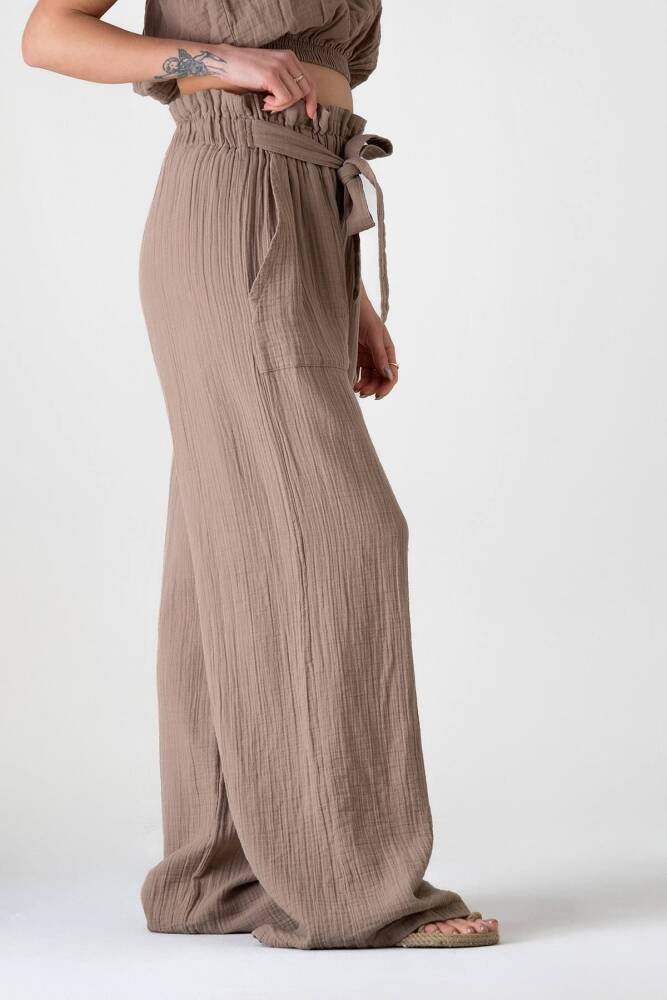 Müslin Kumaş %100 Pamuk Yüksek Bel Büzgü Detay Cepli Bayan Müslin Pantolon Vizon