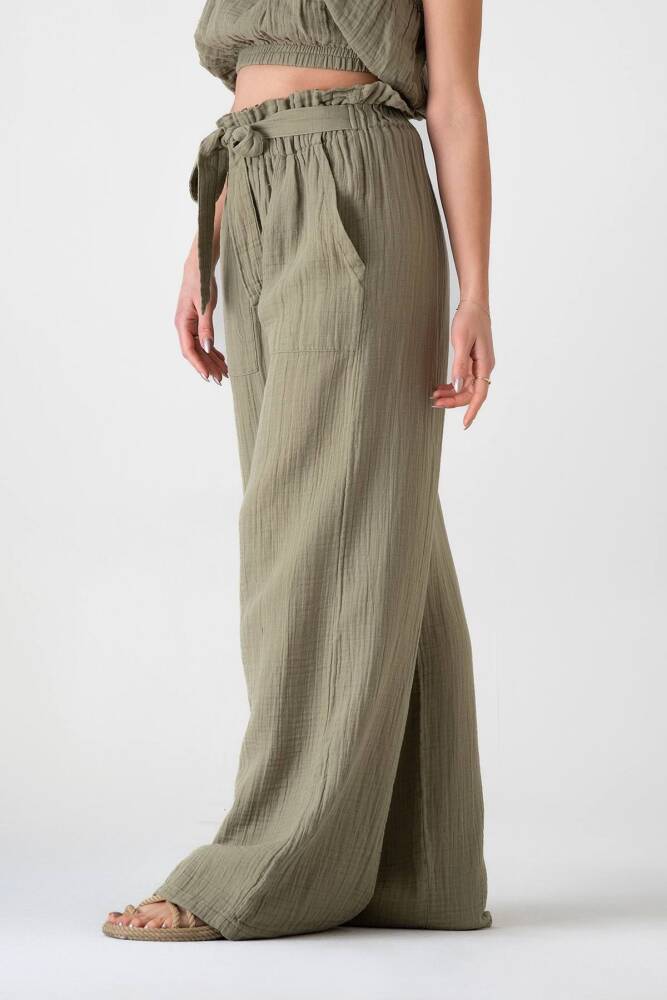 Müslin Kumaş %100 Pamuk Yüksek Bel Büzgü Detay Cepli Müslin Pantolon