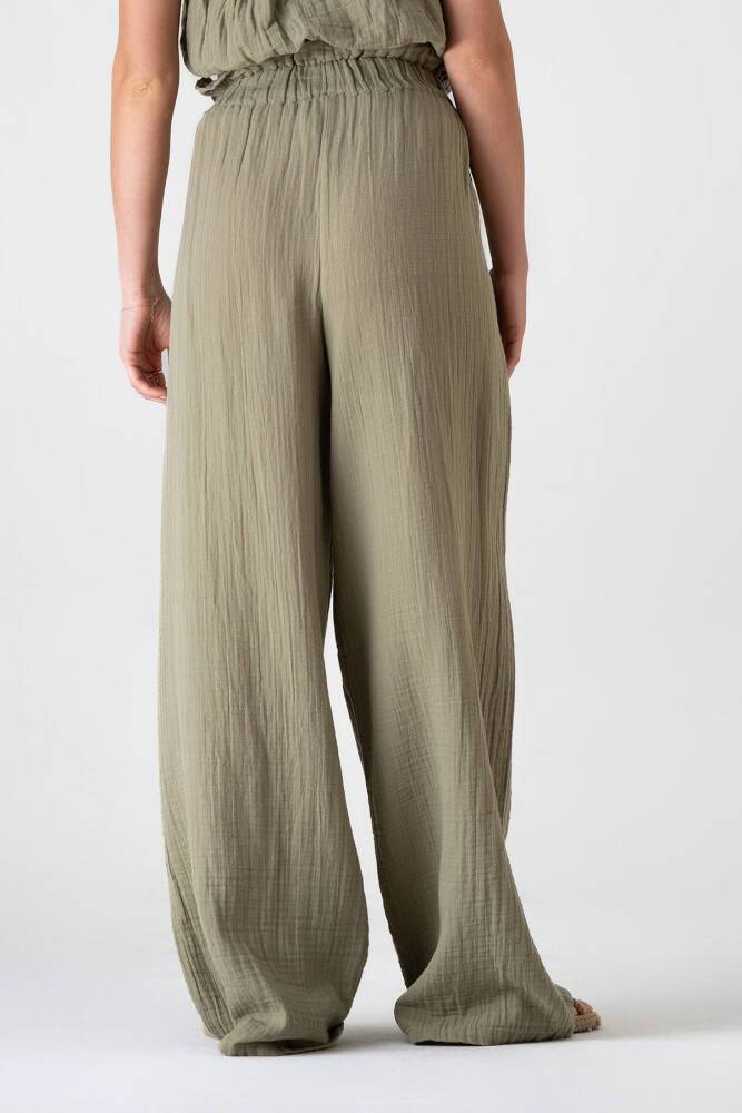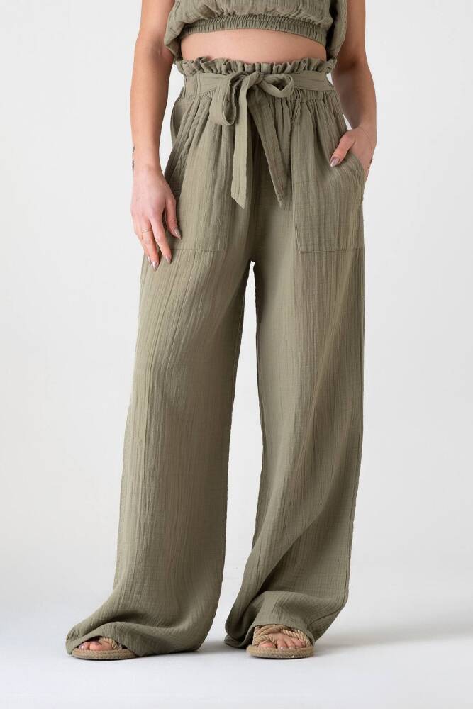 Müslin Kumaş %100 Pamuk Yüksek Bel Büzgü Detay Cepli Bayan Müslin Pantolon Yeşil