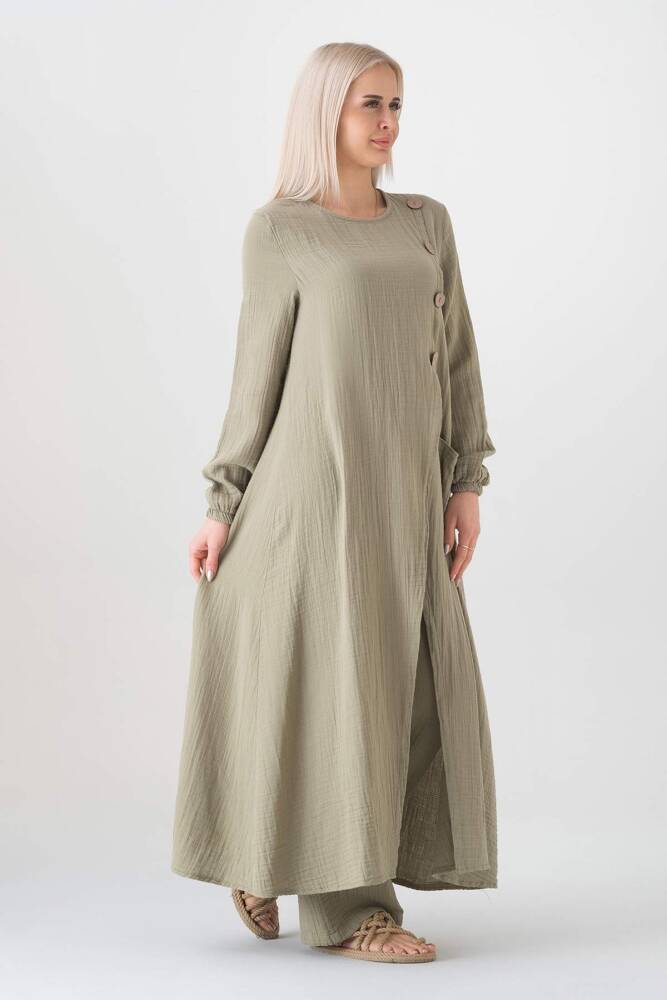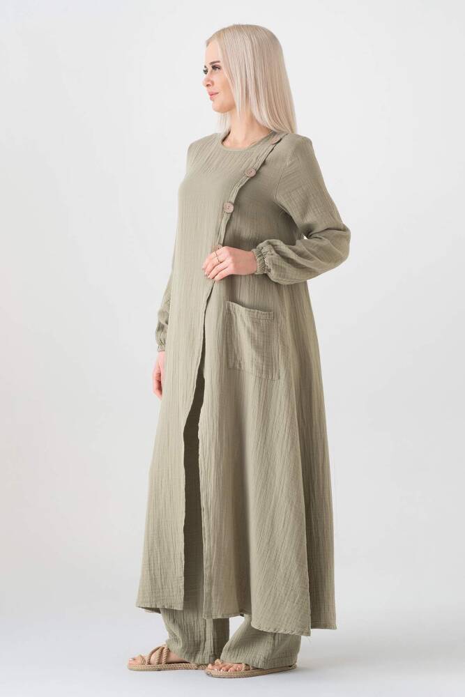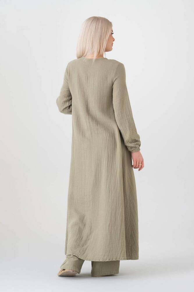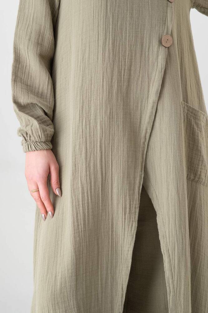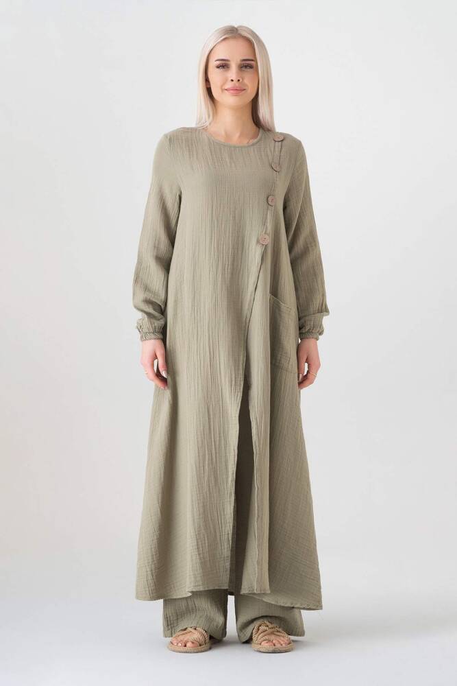 Müslin Kumaş Düğme Detay Önden Yırtmaçlı %100 Pamuk Tesettür Tunik Yeşil
