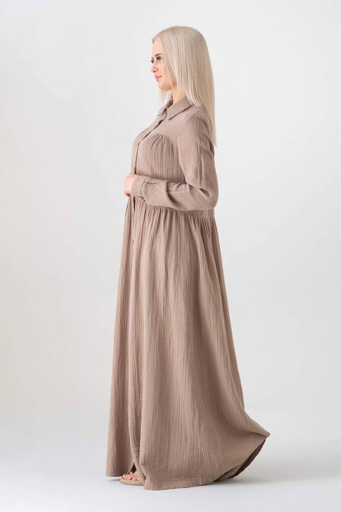 Müslin Kumaş Önden Düğmeli %100 Doğal Pamuk Kumaş Yazlık Uzun Tesettür Elbise Vizon