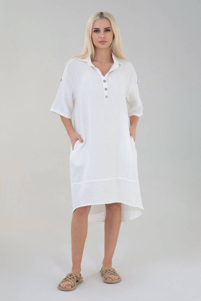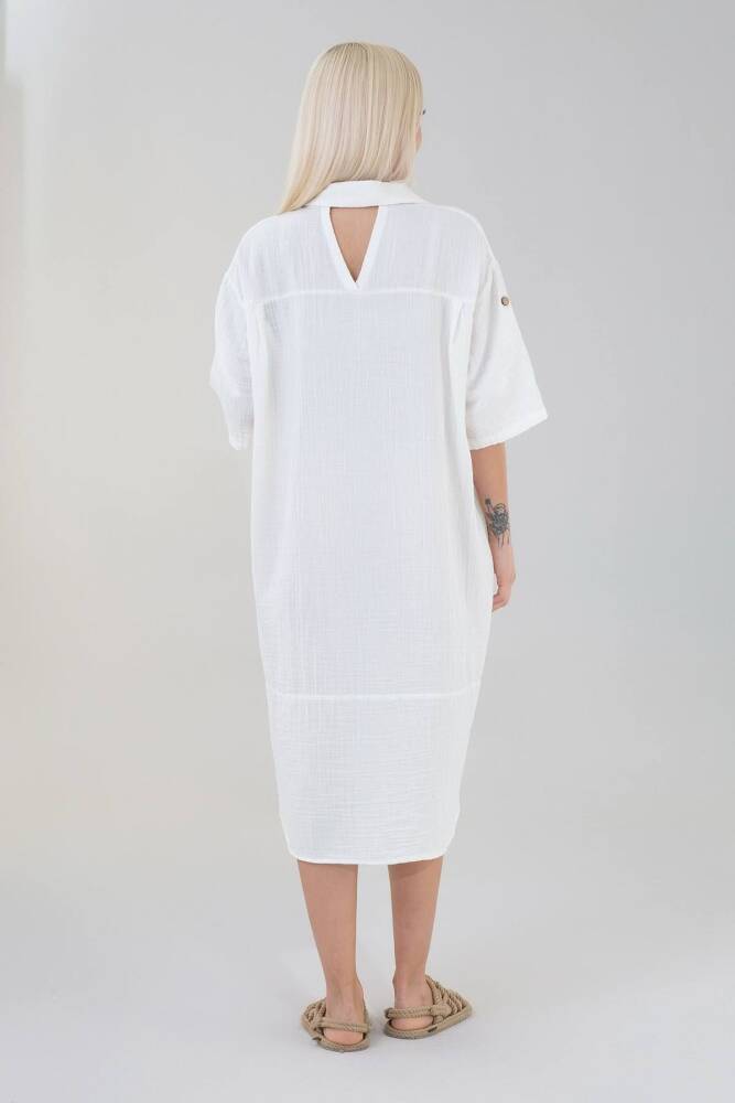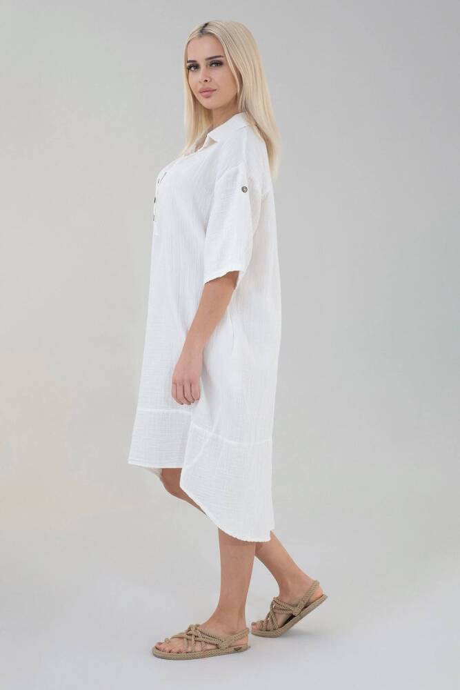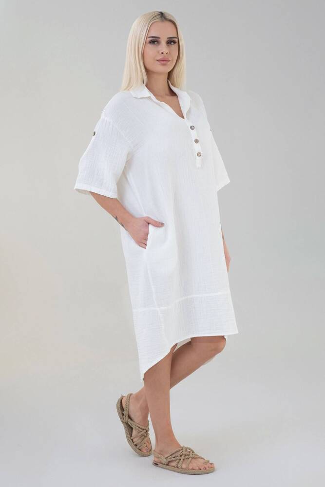 Müslin Robası Pencereli Pamuk Doğal Kumal Uzun Fakir Kol Elbise Beyaz