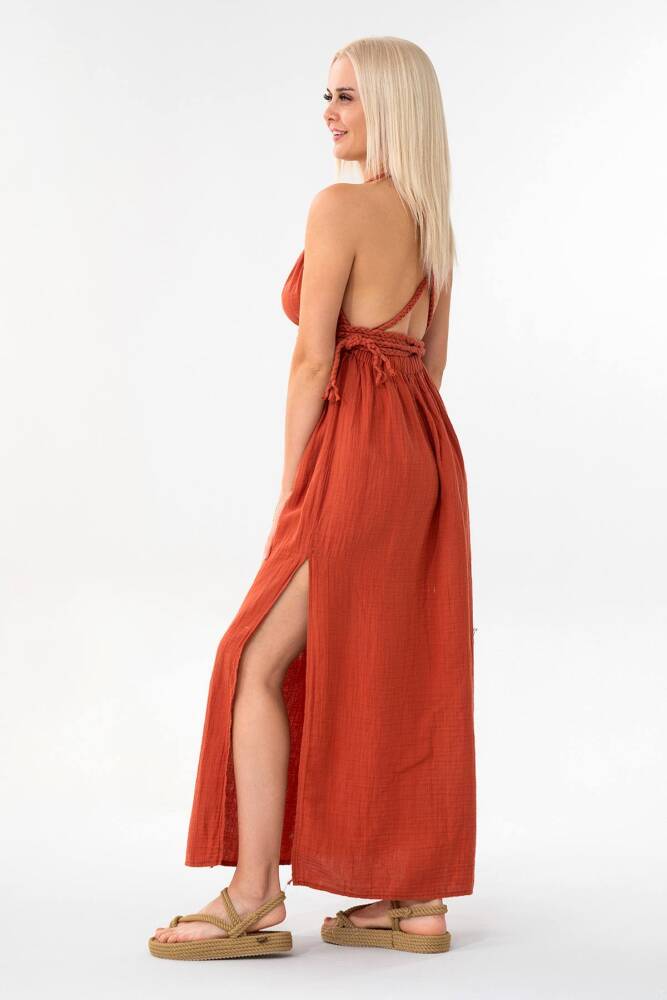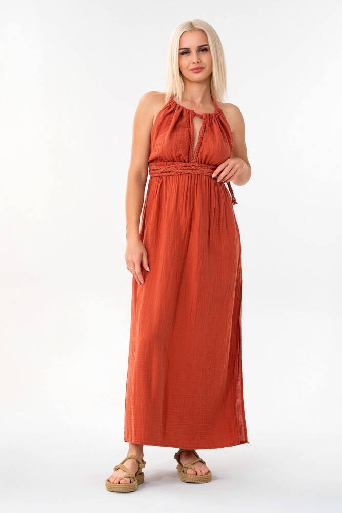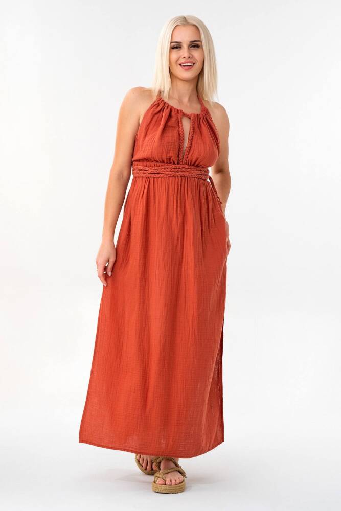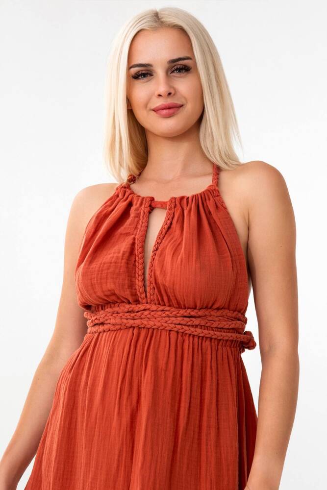 Müslin Yazlık Elbise Örgü Detay %100 Pamuk Doğal Kumaş Kiremit